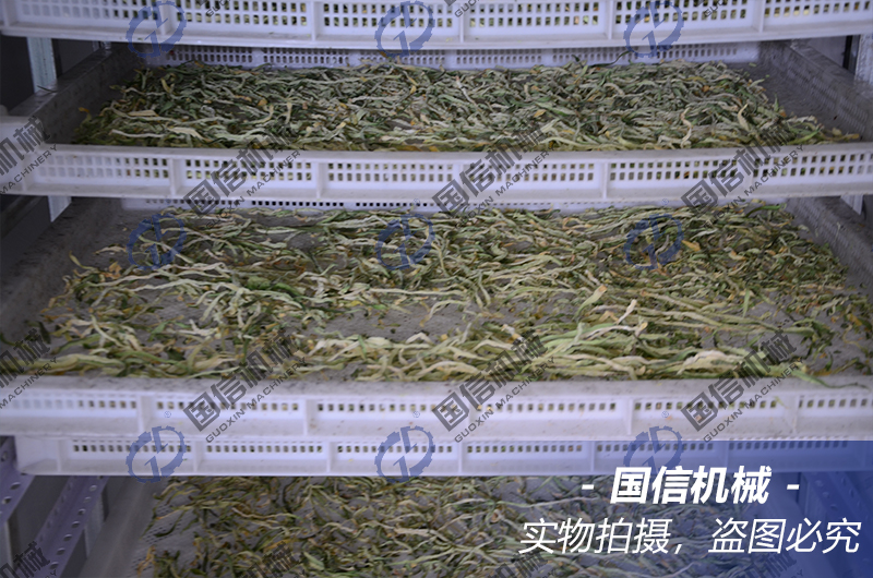 當蔬菜水分蒸發(fā)率達到50-60%左右時,游離水很大程度的減少,這個時候蔬菜內部水分擴散速度減慢,此其表面的水分汽化還慢,這個階段稱蔬菜的減速階段,隨著水分的進一步蒸發(fā),烘干室的溫度也逐漸升高,使水含量達到一個平衡含水率,物料水分含水量在15%左右,烘干時間為8-15 個小時,干燥完成,這時達到烘干的優(yōu)質效果。