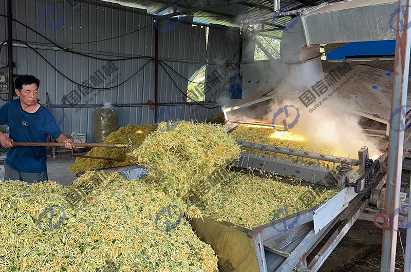 國信烘干機(jī)廠家通過對市場上人們干制金銀花的需求進(jìn)行研究,推出了全自動流水線的金銀花烘干加工設(shè)備-大型全自動金銀花烘干機(jī)設(shè)備。