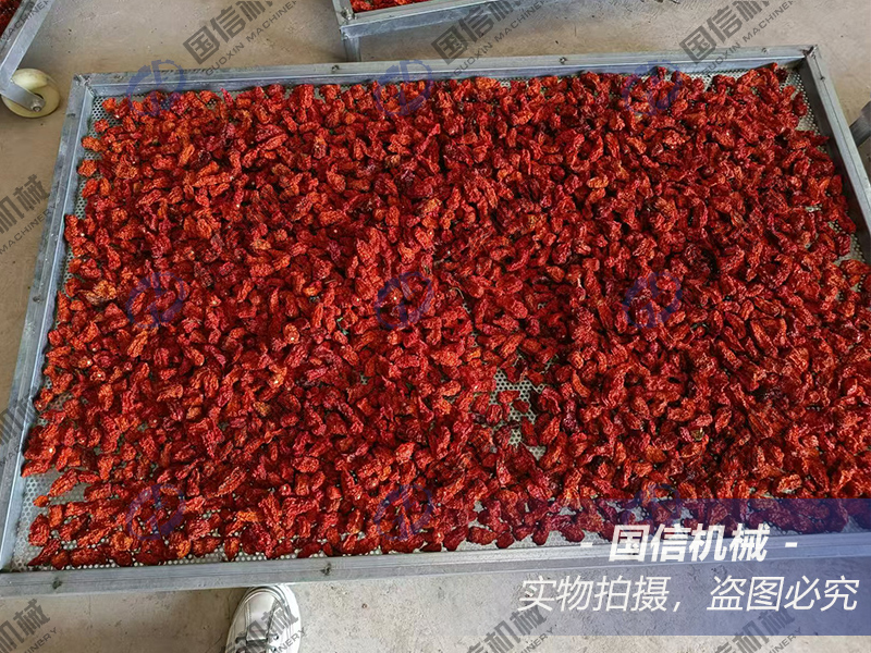 1.堆放厚度:在使用烘干機(jī)烘干辣椒的過程中,要注意辣椒的堆放厚度,建議辣椒的堆放厚度為20-25毫米左右即可。辣椒堆放太?。弘m然透氣性好,風(fēng)阻小,有利于熱交換,但會導(dǎo)致辣椒與熱空氣的接觸時間縮短,從而導(dǎo)致熱利用率降低。辣椒堆放太厚:則會使熱風(fēng)流通阻力增大,熱空氣無法穿透物層,導(dǎo)致辣椒烘干效果較差甚至出現(xiàn)無法烘干的問題。