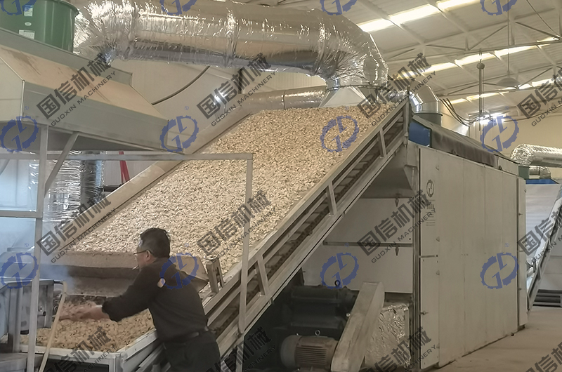 冷水漂洗:漂燙好的鱗片立刻投入氣泡清洗機(jī)的冷水中漂洗至冷,瀝干表面的水分。 熱風(fēng)干燥:把瀝干表面水分的鱗片放入料斗內(nèi),經(jīng)自動(dòng)鋪料裝置送入百合烘干機(jī)上上層進(jìn)行干燥,溫度控制在60-70℃,在網(wǎng)帶的帶動(dòng)下,百合鱗片從上層往下層移動(dòng)。運(yùn)行中,百合片受到翻料器的翻動(dòng),同時(shí),百合鱗片有多次往下落的過(guò)程,使百合鱗片翻動(dòng)更徹底。最后,干燥至百合鱗片含水量至10%左右(手摸鱗片發(fā)脆為度),干燥好的百合干片從百合烘干機(jī)底層的出料口排出。