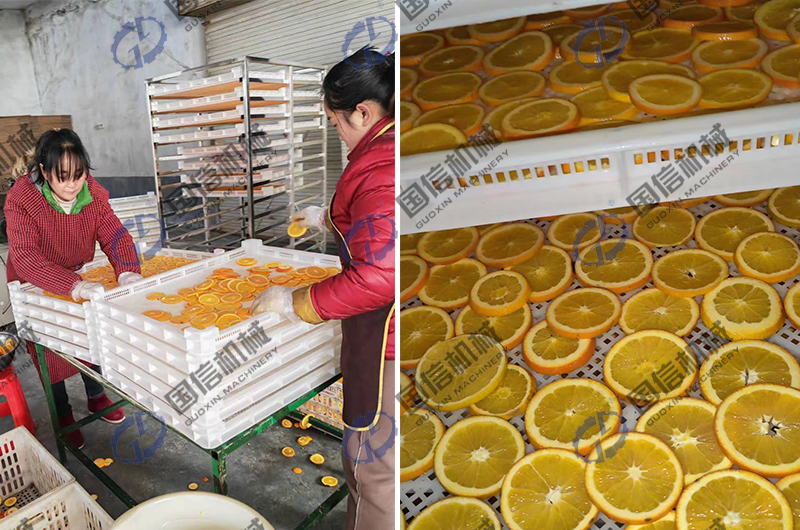 首先把橙子進行清洗切片,均勻的擺放在托盤上,放入烘干房內即可;烘干階段,設定橙子烘干所需的溫度濕度等參數(shù),一般溫度在45-60度之間,時間大約5小時以上,按照你所需要的軟硬程度,設定具體的控制時間即可。使用這種橙子烘干工藝,對橙子進行烘干,可以很好的保證橙子干自身的口感,也解決了橙子產(chǎn)量過剩的問題,有效的增加了橙子自身的經(jīng)濟價值,這也是我們國信機械廠家眾多水果烘干加工的一種,其實我們在為客戶提供烘干設備的同時,也會對物料干制加工進行整體的烘干解決方案提供,通過近二十年的發(fā)展,我們積累了大量的水果烘干加工經(jīng)驗,如果你有相關需求,可與我們聯(lián)系,進行相關的經(jīng)驗交流。