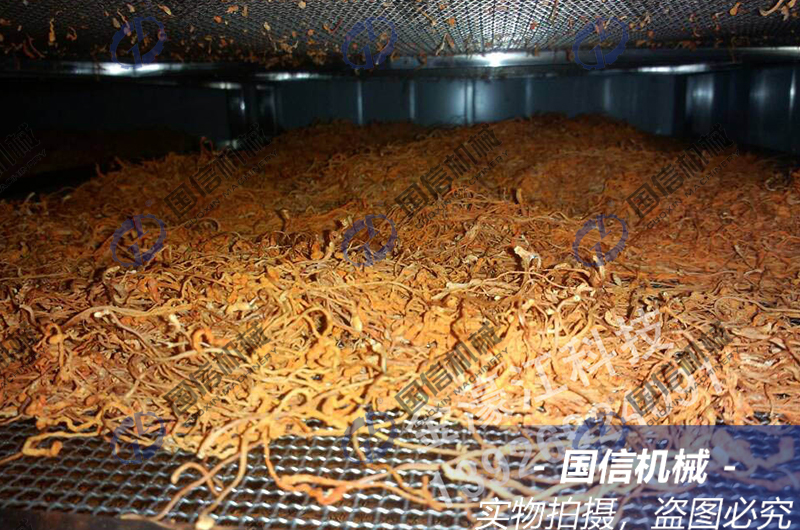 蟲草花烘干機(jī)工藝:初步排水階段:由于剛培育出來的蟲草花含水分含量達(dá)到87%以上,因此,前期需要用35℃左右的溫度,來烘烤3~4小時,先初步的排出一部分水分;